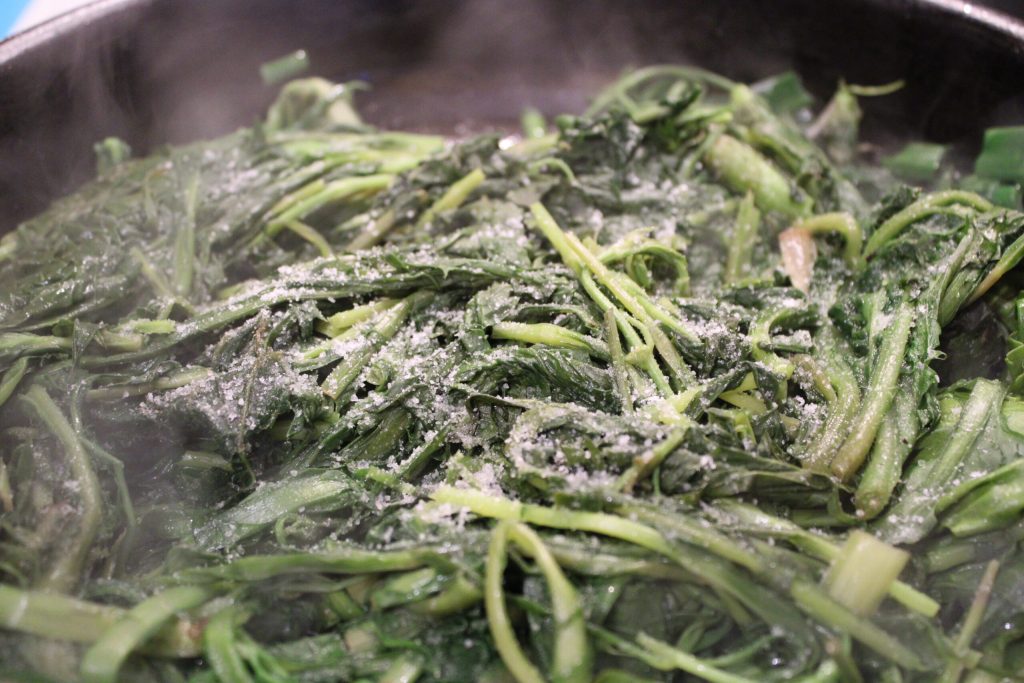 In der Zwischenzeit, nachdem Sie alle Wildkräuter gut gereinigt und fünf Minuten blanchiert haben, schneiden Sie die Frühlingszwiebeln und lassen sie in einer Pfanne mit wenig Öl anbraten.