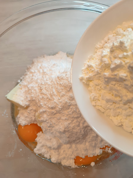 Geben Sie alle Zutaten in eine Schüssel: Mehl, die zwei Eier, 150 g Puderzucker, Vanillearoma, Butter und Kartoffelstärke und kneten Sie schnell zu einem Teig, formen Sie eine Kugel und lassen Sie diese, in Frischhaltefolie gewickelt, 30 Minuten im Kühlschrank ruhen.