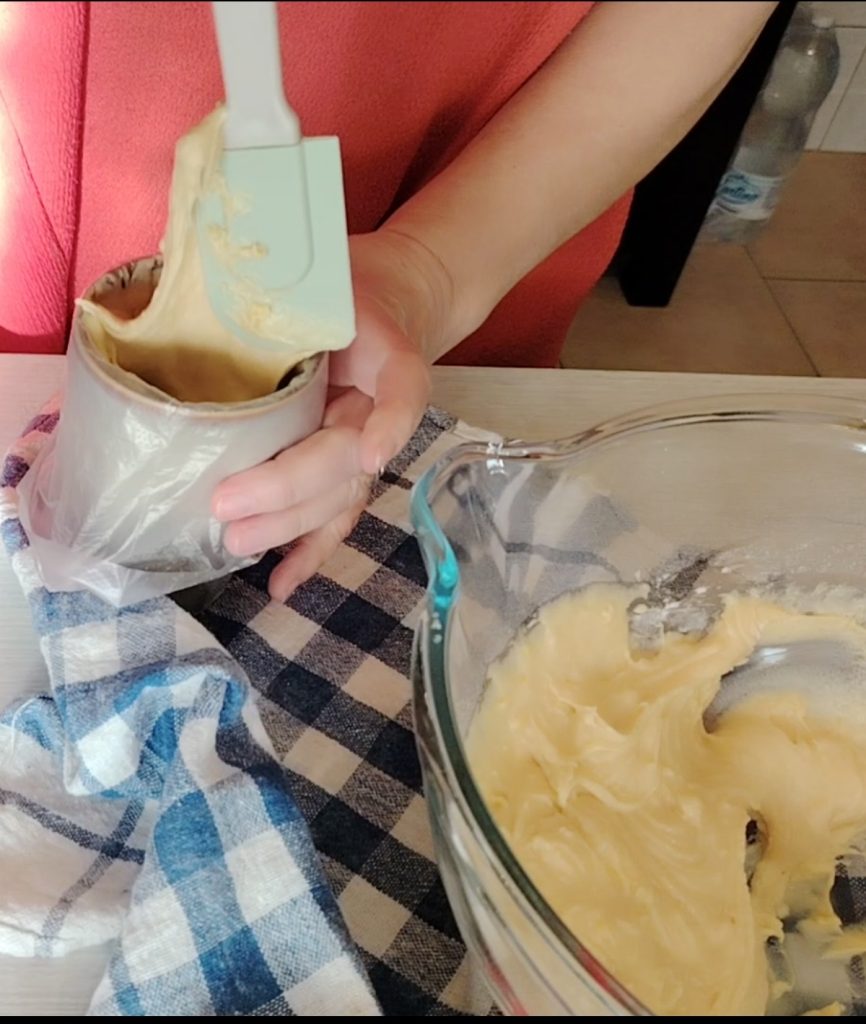 Mit Hilfe eines elektrischen Mixers eine weiche Masse herstellen und dann in einen Spritzbeutel mit glatter Tülle umfüllen.