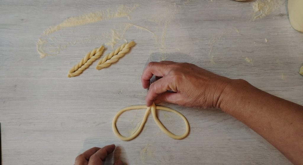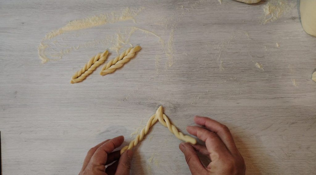 Drehen Sie die beiden Enden zusammen und verbinden Sie sie am Boden. Fahren Sie fort, bis der Teig verbraucht ist.