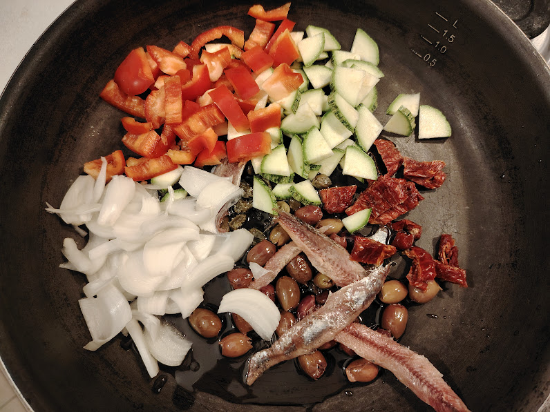 In einer Pfanne mit Olivenöl fügen Sie das in Stücke geschnittene Gemüse hinzu, einschließlich der getrockneten Tomaten, Oliven, Kapern und filettierte Sardellen, und braten Sie langsam an, während Sie das Wasser für die Nudeln zum Kochen bringen.