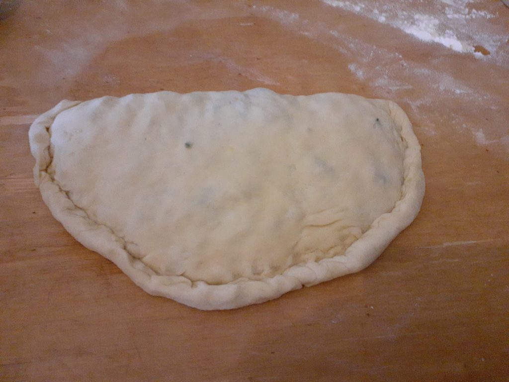 Nachdem die Kräuter gekocht wurden, in der Pfanne mit Knoblauch anbraten. Auf den Teig legen und halbmondförmig schließen