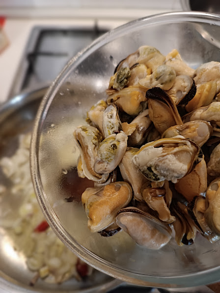• In Wirklichkeit müssen wir zuerst an die Miesmuscheln denken, da sie vorher geschält werden müssen…Indem wir sie in einen Topf mit Deckel geben, um sie zu öffnen und anschließend die Schalen zu entfernen.