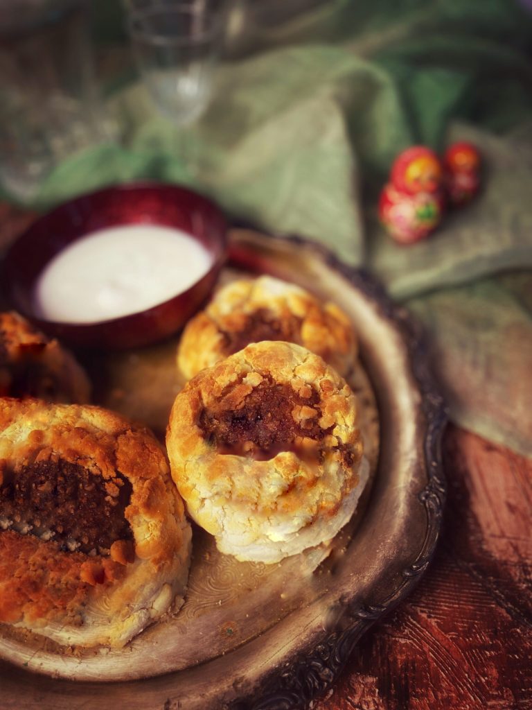 Für den Teig folgen Sie dem Rezept der russischen Pirozhki auf dem Blog, ohne Zucker und mit Salz.