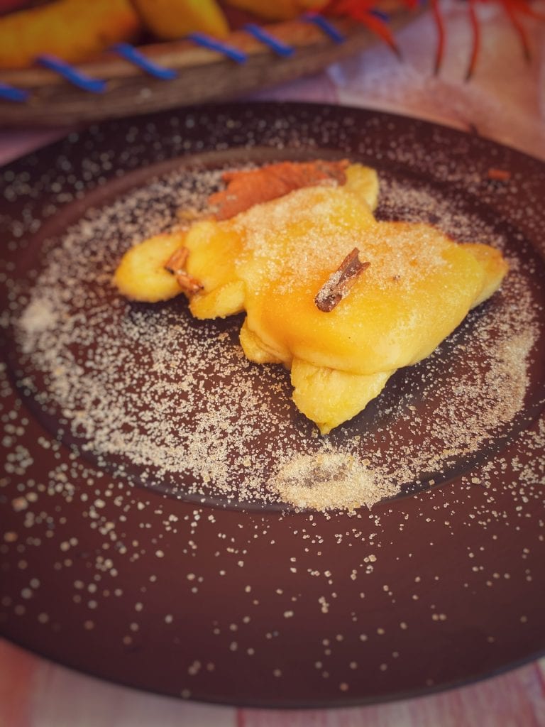 Es handelt sich um frittierte Bananen in Butter oder Öl, Käse oder geschmolzene Butter darüber, bestäubt mit Zimt und Zucker (manchmal auch mit Schokoladensirup).