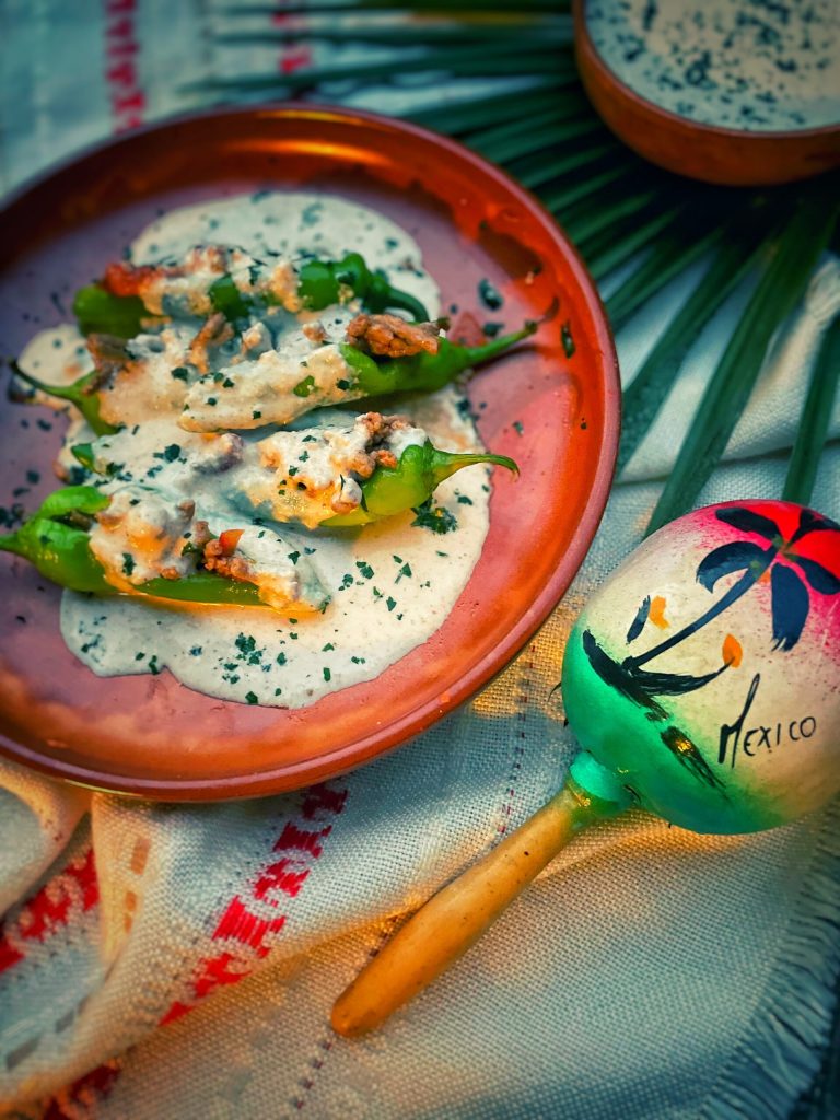 Chile en Nogada = nicht frittiert, süß-salzige Füllung, kalte Walnusssauce