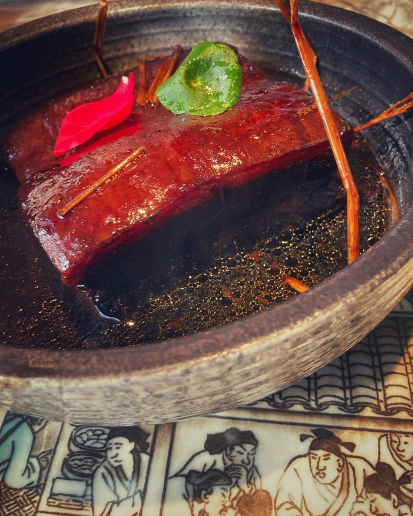 Das Dongpo rou, 东坡肉, auch bekannt als dongpo pork oder dongpo meat, ist ein typisches Gericht aus Hangzhou, das mit in Sojasoße geschmortem Schweinebauch und Reiswein zubereitet wird, durch einen langen Prozess namens „rote Garung“.
