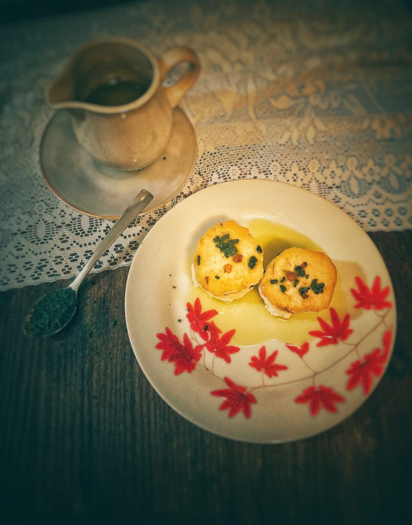 ➡️Französischen Ursprungs habe ich sie mit Spirulina (grün) angereichert und zu falschen Tofu-Jakobsmuscheln serviert.
