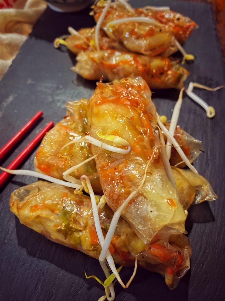 Ich habe sie „klassisch“ gemacht, wie man sie im Westen kennt, nämlich mit Gemüse, sowohl im Ofen gebacken (siehe Foto unten) als auch frittiert, und habe sie mit der klassischen chinesischen süß-sauren Sauce serviert, die mit Tomaten, Salz und Reisessig sowie Sojasauce hergestellt wird, und Chips aus Reispapier, die in heißem Öl frittiert werden.