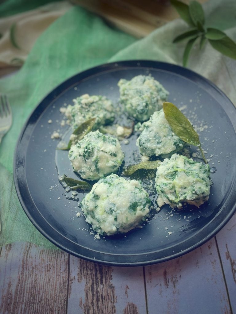 Es handelt sich um weiche Bällchen aus Ricotta, Spinat und Mehl, die normalerweise mit geschmolzener Butter und Salbei gewürzt werden.