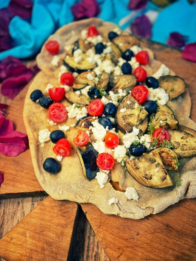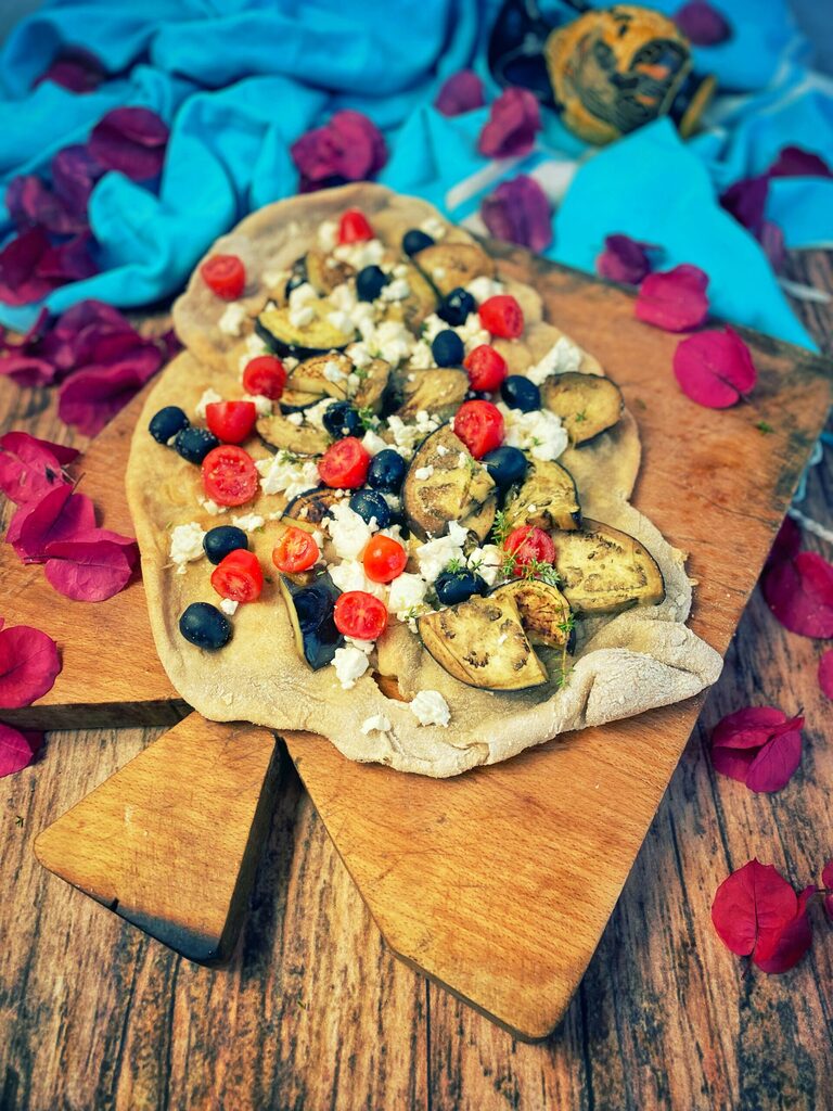 ▶“Mediterrane“ Füllung aus gegrillten Auberginen, Feta, schwarzen Oliven, Kirschtomaten und frischem Thymian, zweiter Backvorgang im Ofen bei 300°C für 5 Minuten.
