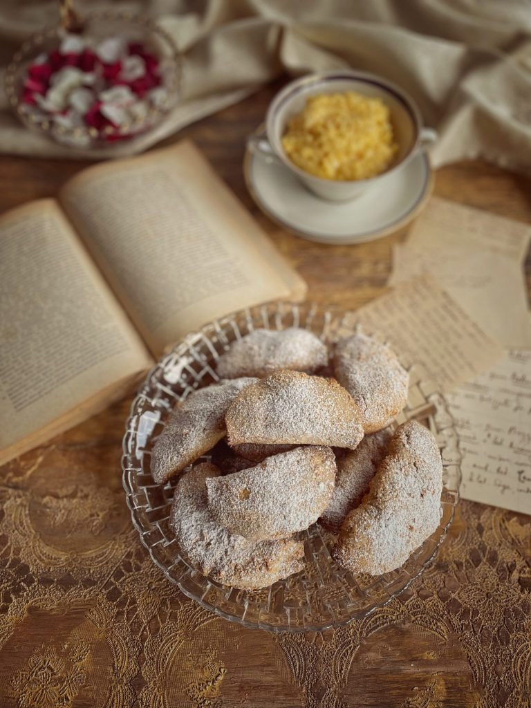 Es handelt sich um halbmondförmige Mürbteigkekse, gefüllt mit einer weichen Masse (manchmal auf Mandelbasis), die an kleine süße Tortelli erinnern.
