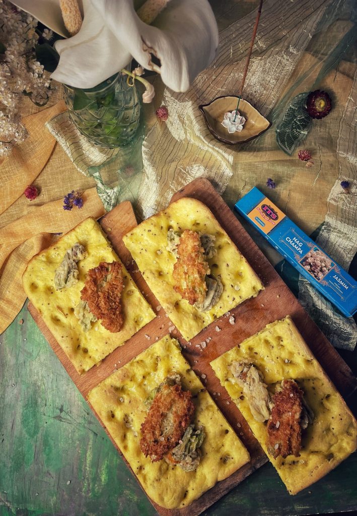 Glutenfreies Focaccia mit frittierten Zucchiniblüten