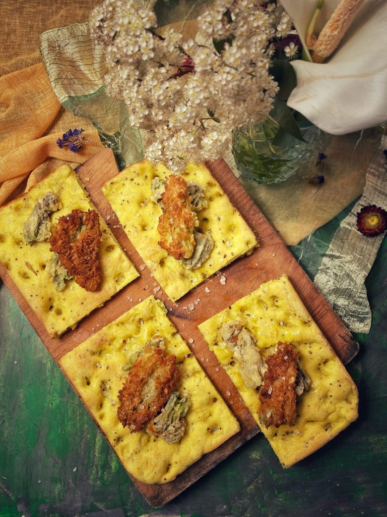 Glutenfreies Focaccia mit frittierten Zucchiniblüten