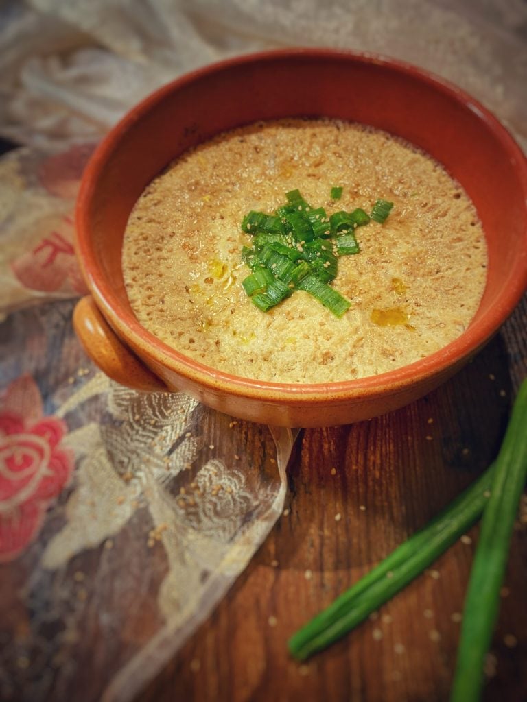 ▶️Die Eier werden gesiebt und mit Wasser oder mit Dashi- und/oder Anchovisbrühe für einen reicheren Geschmack geschlagen, bis die Mischung vollständig vermischt ist und eine cremige Konsistenz hat.