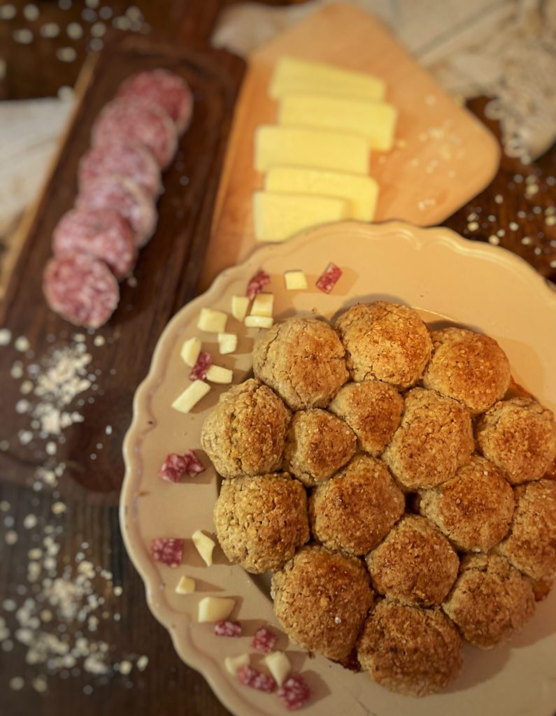 Jede Portion zu einer Scheibe ausrollen und nach Belieben mit Salami und Provola füllen.