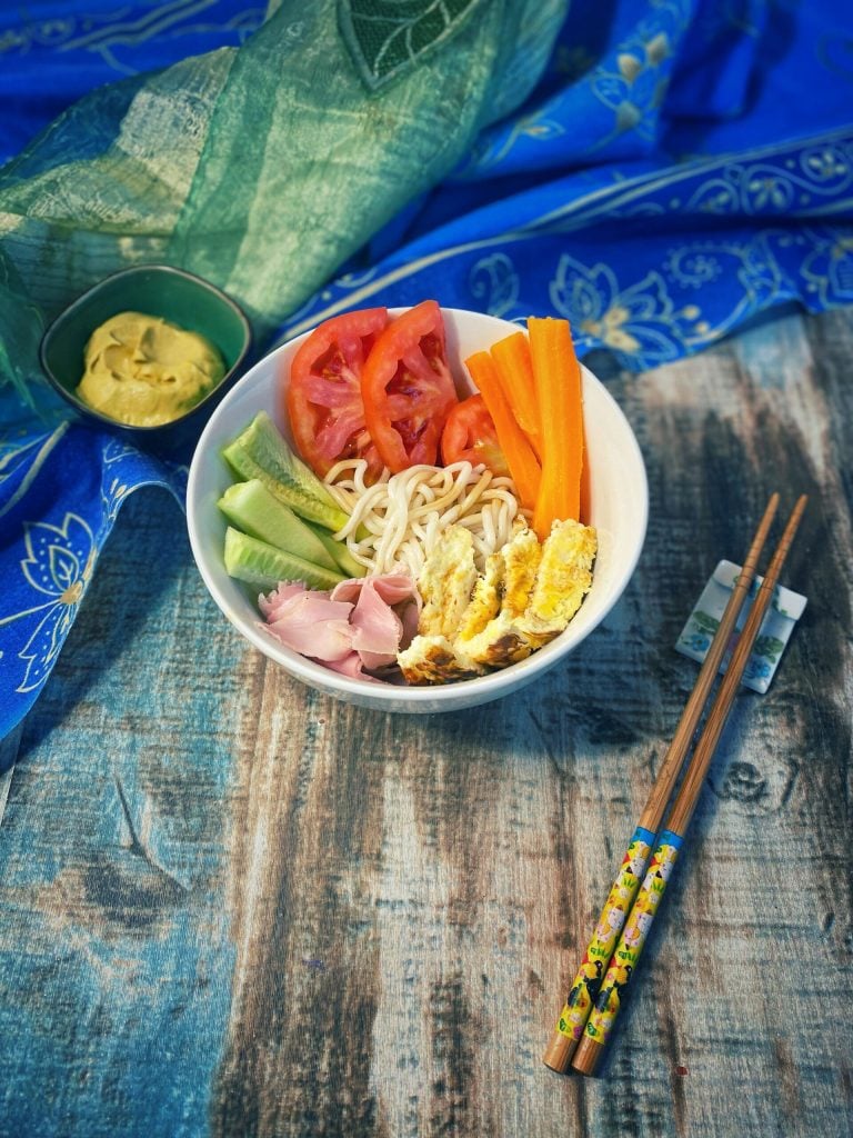 Es handelte sich um kalte Nudeln, die mit geschnittenen Sojasprossen, Kohl, Menma, Tomate und Chashu-Schweinefleisch belegt und mit etwas Sojasauce gewürzt waren.
