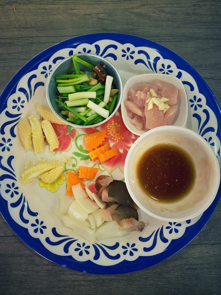 Den Knoblauch hacken und die Zwiebel, die Frühlingszwiebel in drei Teile inklusive des Stängels, die Chilischoten, die Karotte, den Babymais, die Pilze und das Zitronengras in Stücke schneiden.