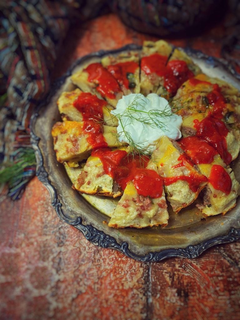 Den Khanum in Stücke von etwa 5/6 cm schneiden und mit der Tomatensoße übergießen und mit Smetana oder saurer Sahne oder Naturjoghurt servieren.