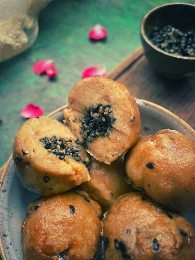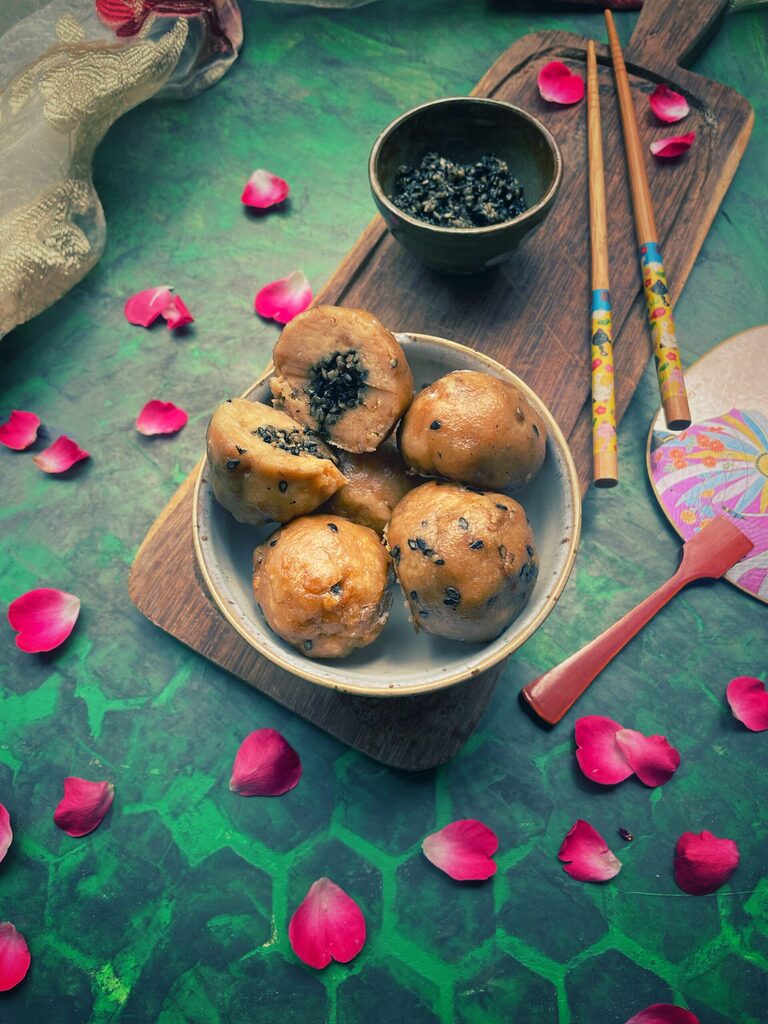 • Manjū aus Okinawa mit einer Füllung aus violetter Süßkartoffel, Butter, Milch, Zucker und Salz.