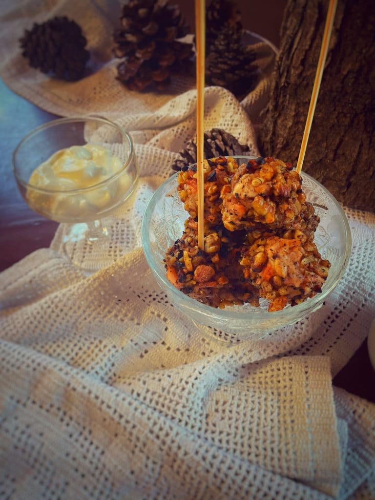 Kleine Frikadellen aus dem Lachs formen, im Pekannuss-Crumble wälzen und in der Heißluftfritteuse bei 175 °C (oder im Umluftofen bei 190 °C) 4 Minuten (im Ofen 5 Minuten) garen.