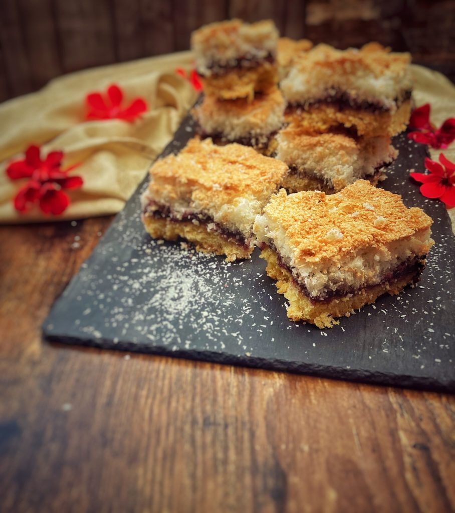 Der englische Bakewell-Kuchen ist sicherlich ein Verwandter; der Unterschied besteht darin, dass im Bakewell die Kokosbaiser durch Mandelcreme ersetzt wird.