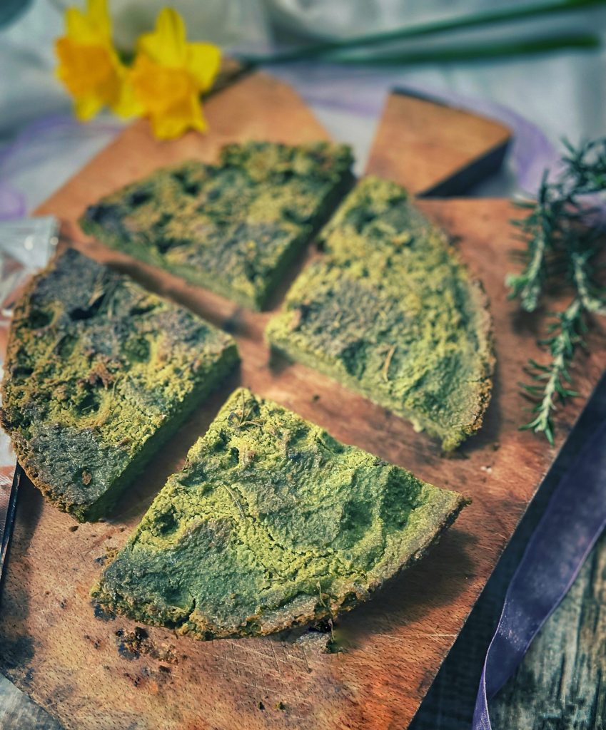 Ein Teig mit allen Zutaten außer Rosmarin und Öl herstellen, abdecken und 2 Stunden gehen lassen.