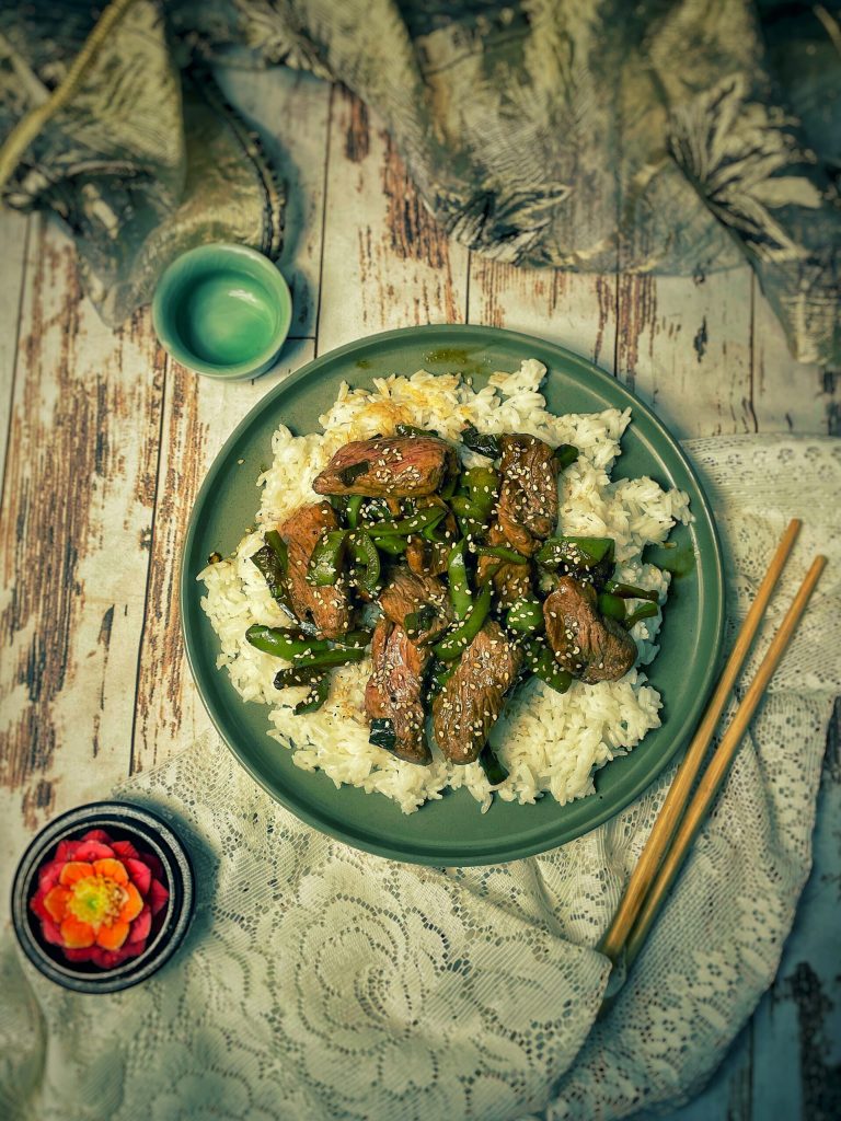 Das mongolische Rindfleisch auf den gedämpften Reis gießen und servieren, mit Sesam dekorieren.