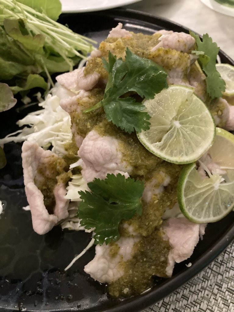 Eine scharfe Sauce mit Knoblauch und Limette, die über Scheiben von Schweinefleisch (Schulter oder Lende) gegossen wird, serviert auf einem Bett von knackigem Kohl und garniert mit Koriander.