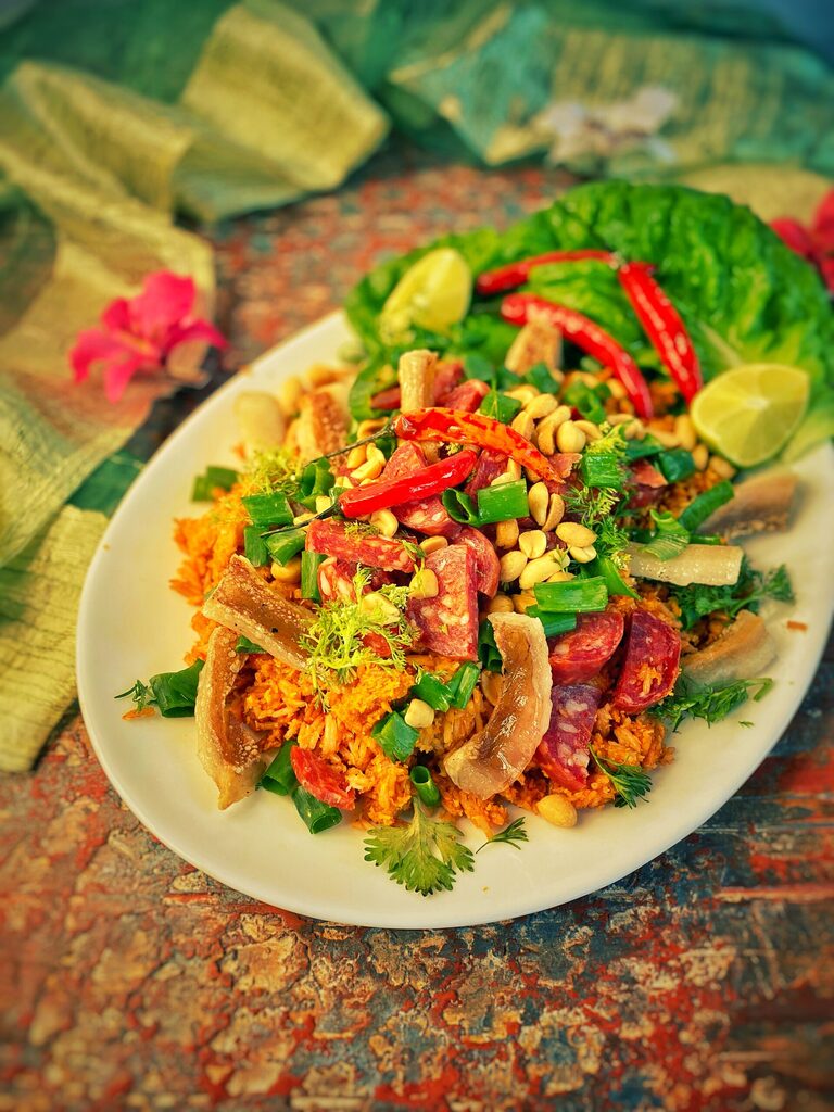 Nach dem Abkühlen die Reisbällchen in einer Schüssel zerbröseln und mit Fischsoße, Limettensaft, Salz, in Scheiben geschnittener Schweinswurst, Schweineschwarten, Koriander, Minze, Frühlingszwiebeln und gehackten Erdnüssen würzen.