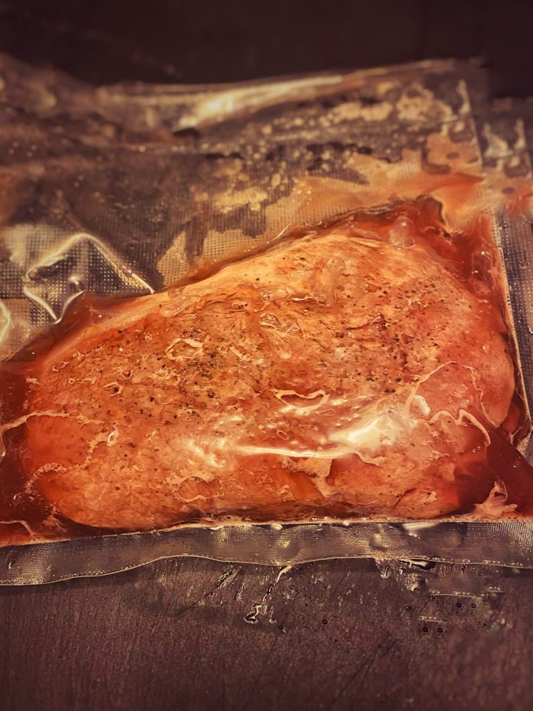 Die empfohlene Garstufe ist medium rare, also eine Temperatur zwischen 54 und 58°C zu erreichen. Daher habe ich mich entschieden, es bei niedriger Temperatur zu garen, für 2 Stunden bei einer konstanten Wassertemperatur von 52°C.