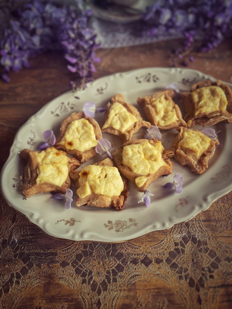 Die Pardulas de arrescottu sind kleine, von Hand „gezwickte“ Hefeteigkörbchen, die eine Füllung auf Ricotta-Basis mit Safran und Zitrusabrieb umschließen.
