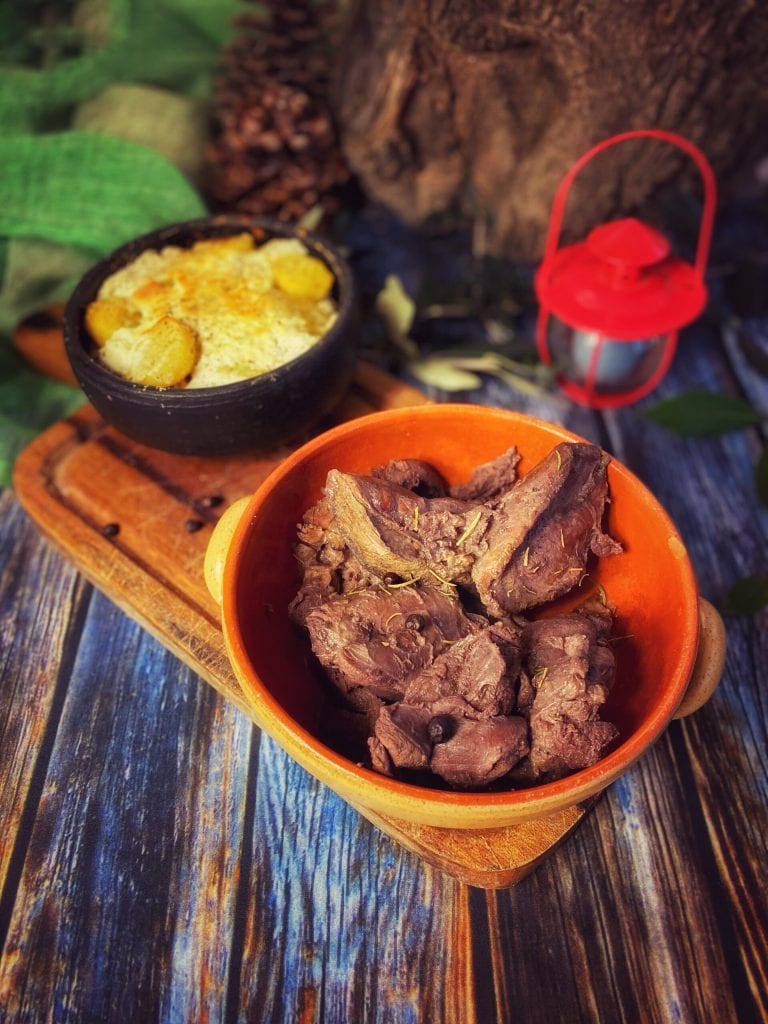 Die Keule in Stücken im Rotwein (500 ml) marinieren, mit Zwiebel, Gewürznelken, geschnittenen Karotten, Wacholder, Lorbeer, abgedeckt, im Kühlschrank für mindestens 8/10 Stunden.