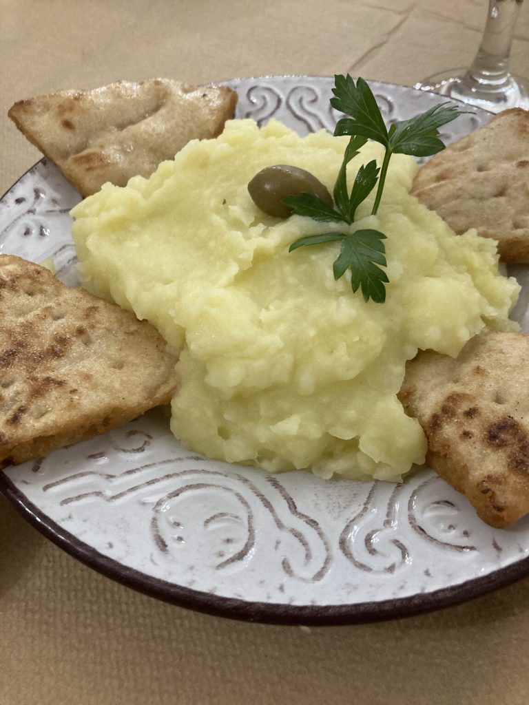 Wie auf dem Foto ist die Skordalia perfekt mit heißem griechischen Pita begleitet.