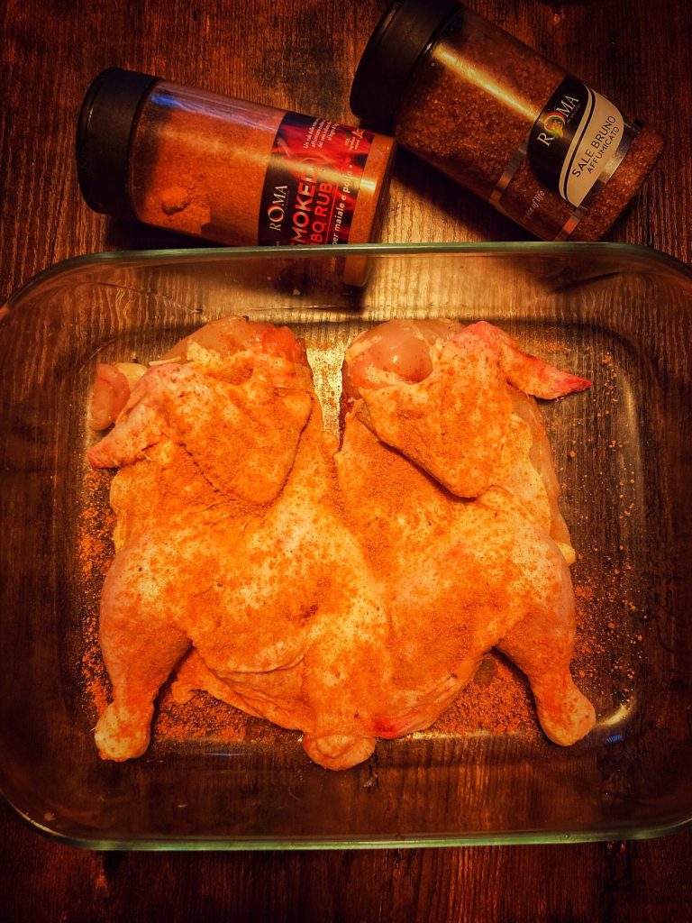 Anschließend das ganze Huhn mit dem gewählten Rub würzen.