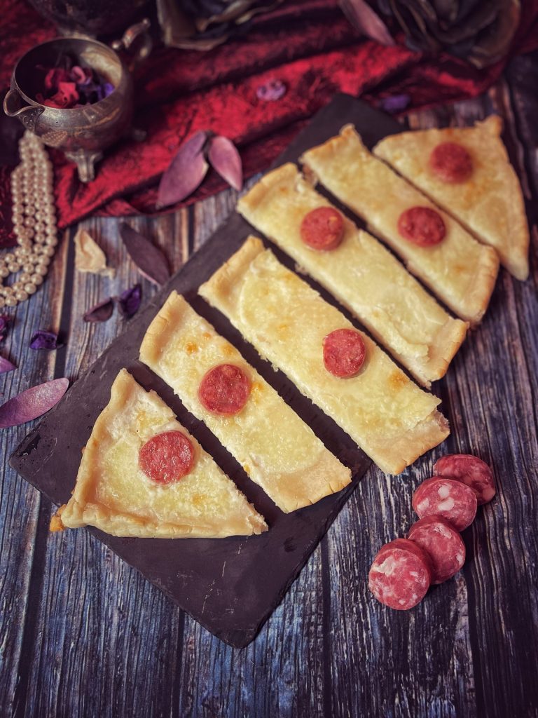 Sucuk besteht, einer würzigen und trockenen Wurst, die typisch für die türkische Küche ist, aber auch auf dem Balkan, im Nahen Osten und in Zentralasien verbreitet ist (in meinem Fall ersetzt durch leicht scharfe Salami).