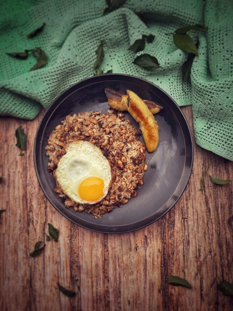 Heiß servieren mit Spiegelei und gebratener Kochbanane.