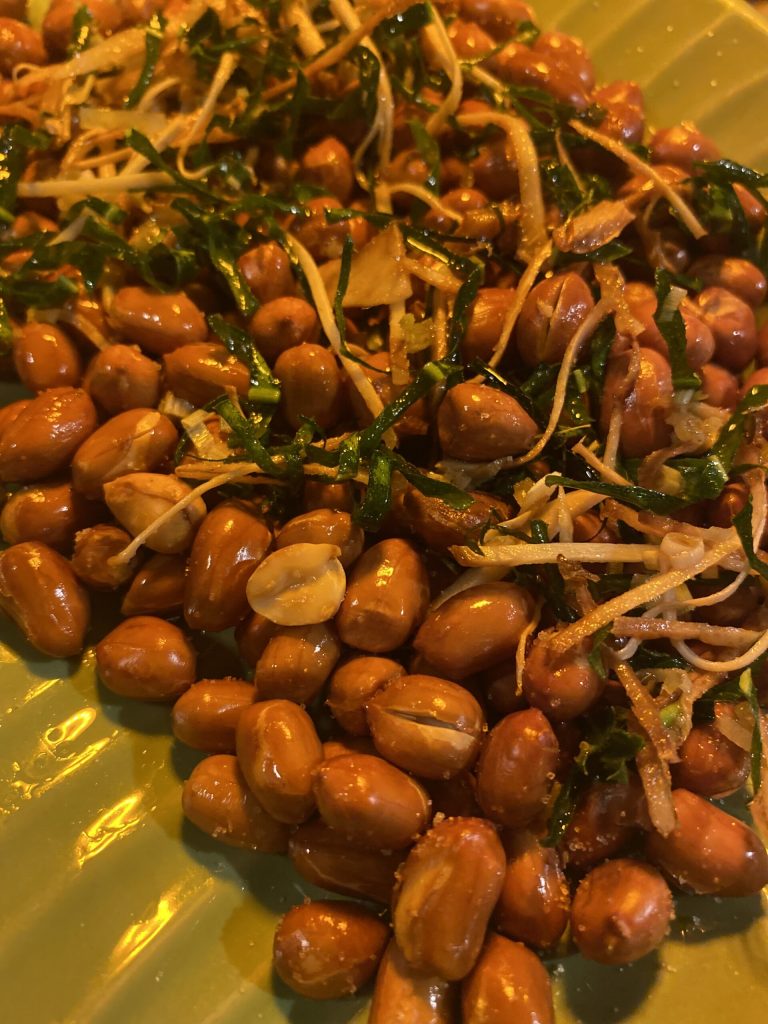 Thua Thawt Samun Phriai sind frittierte Erdnüsse mit Makrut-Limettenblättern, Knoblauch und Chilischoten.
