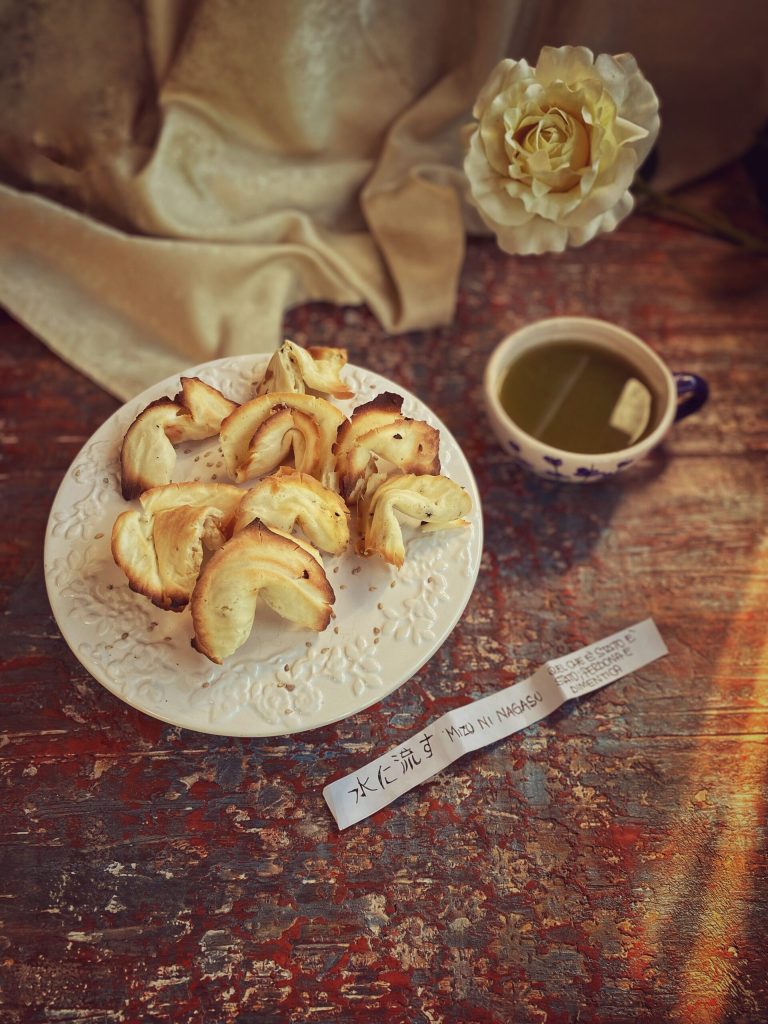 Diese japanischen “Glückskekse” sind weicher, größer und mit dem Zettelchen, das nicht im Inneren verborgen ist, sondern in einer Falte steckt, und sie enthalten Sesam und Miso im Teig, aber keine Vanille und kein Fett, wahrscheinlich mit joshinko, also japanischem Reismehl.