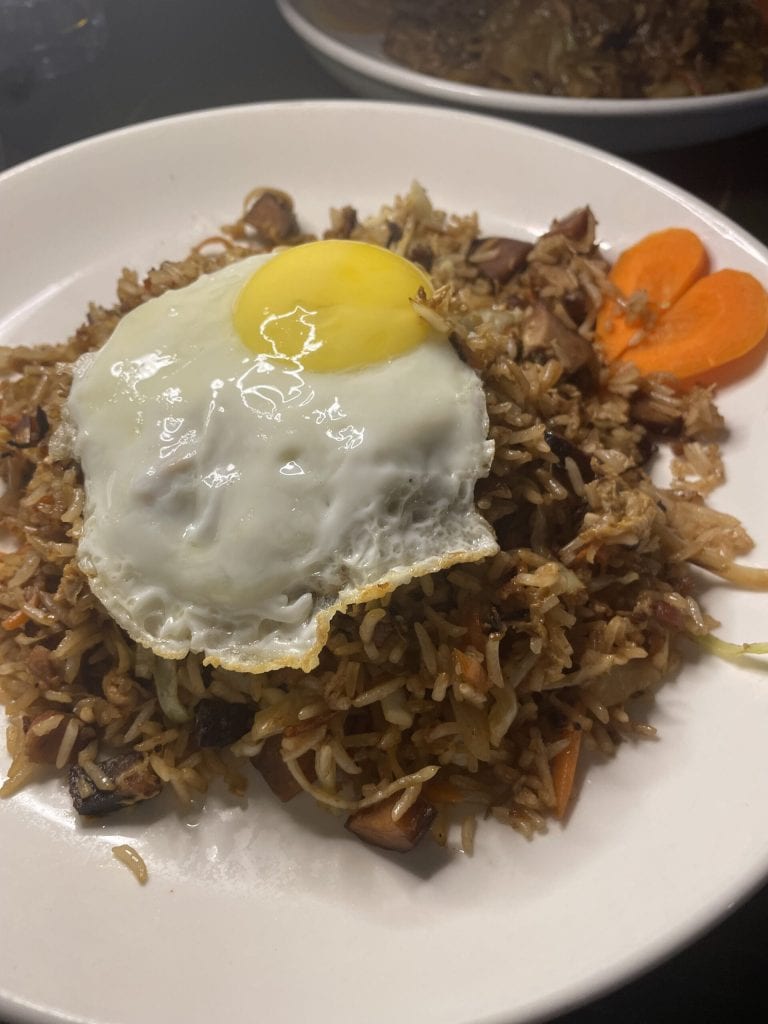 Serviere den Reis heiß mit dem Ei obendrauf.