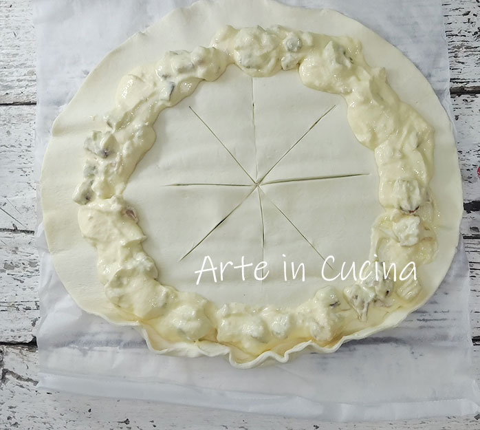 • Lege den Blätterteig auf die Arbeitsfläche und zeichne vom Zentrum ausgehend ein Kreuz, halte 10 cm Abstand zum Rand, dann zeichne 2 Diagonalen und fülle mit der Füllung.