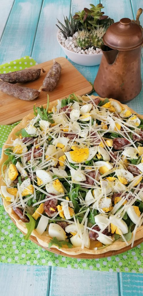 Add the hard-boiled eggs cut into pieces, the sliced cured sausages, and plenty of Parmigiano shavings.