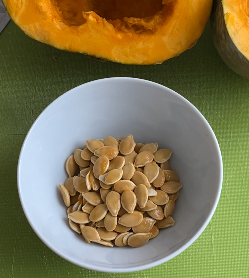 Empty the pumpkin, wash the seeds well and dry them with parchment paper.