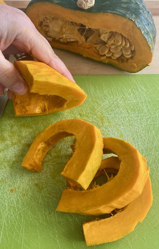 While the potatoes are “pre-cooked”, take a Delica pumpkin and wash it.