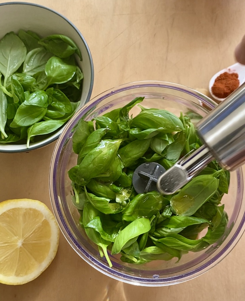 • The basil leaves and the oil.