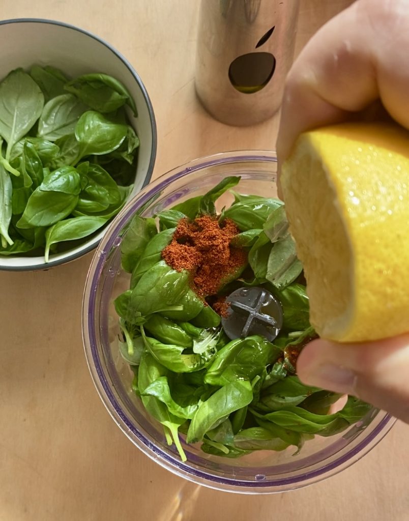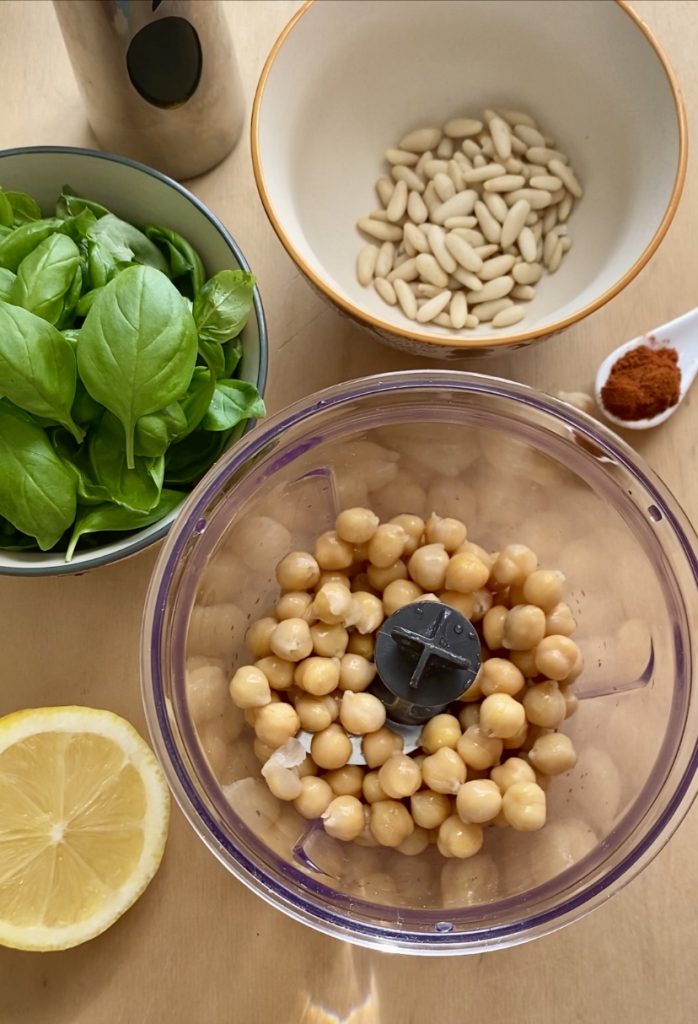 • To prepare the basil hummus you will need chickpeas, some basil leaves, pine nuts, lemon juice, and paprika.