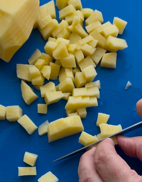 • Heat a drizzle of oil in a pan and cook the potatoes over low heat, stirring occasionally.