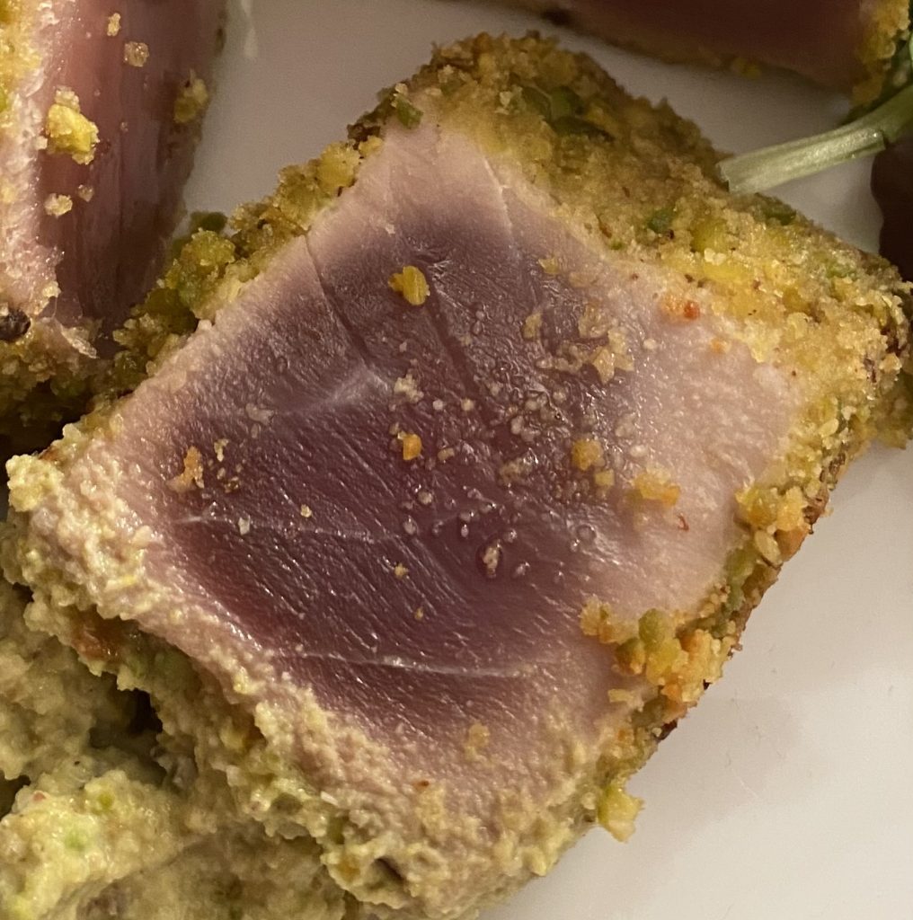 Place the chopped pistachios on a plate and coat the tuna by rolling it to cover all sides.