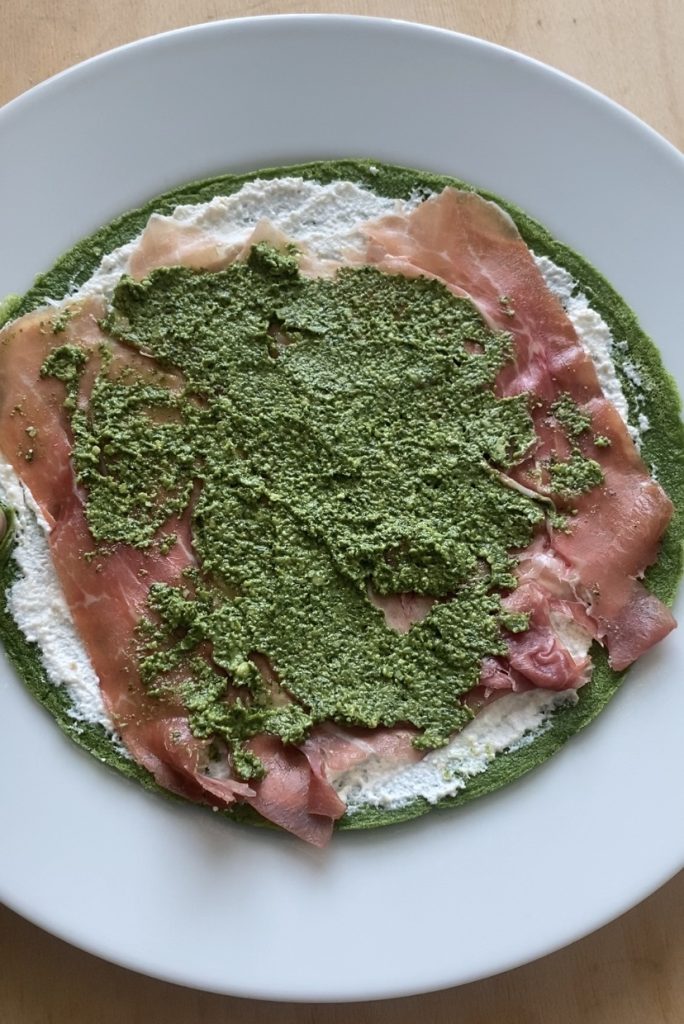 • The filling of the first crepe is ricotta, Parma ham, and pesto.