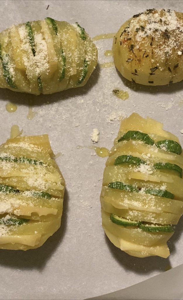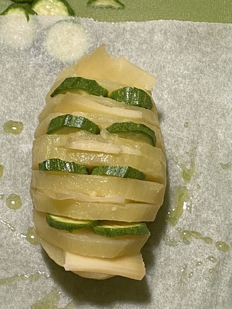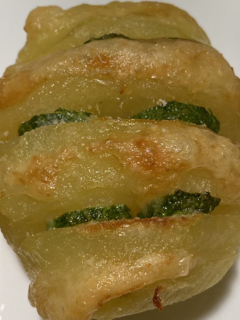 Instead, in this recipe, I’ve added slices of zucchini and fontina cheese between the cuts to make the dish super tasty. You can also add cooked ham when raw.